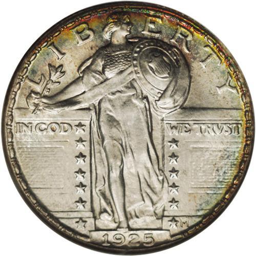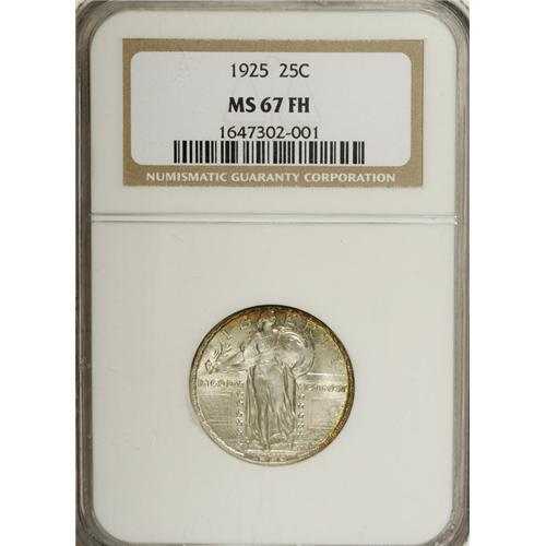 <B>1925 25C MS67 Full Head NGC.</B></I> This date marks the beginning of a new era in the Standing Liberty quarter series, called by some the Type Three design. Only slight modifications were actually made, including a change to the relief of the date from high to low. Both sides have splendid satin luster with light ivory color that is enhanced by peripheral iridescence. Census: 10 in 67, 0 finer (4/07).<BR><I>From The Encinitas Collection.</B></I><BR><BR><b>Shipping:</b> Coins & Currency (<a target="_blank" href="http://www.heritageauctions.com/common/shipping.php">view shipping information</a>) <BR><BR><B>Important notice:</
