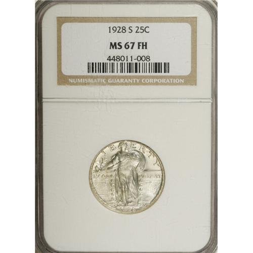 <B>1928-S 25C MS67 Full Head NGC.</B></I> Large Mintmark. The more frequently encountered of the two mintmark sizes known for this issue. This is a highly lustrous, brilliant example that is nearly flawless. Close examination reveals fine die polishing lines in the fields on each side. An exceptional Standing Liberty quarter. Census: 19 in 67, 0 finer (4/07).<BR><I>From The Encinitas Collection.</B></I><BR><BR><b>Shipping:</b> Coins & Currency (<a target="_blank" href="http://www.heritageauctions.com/common/shipping.php">view shipping information</a>) <BR><BR><B>Important notice:</