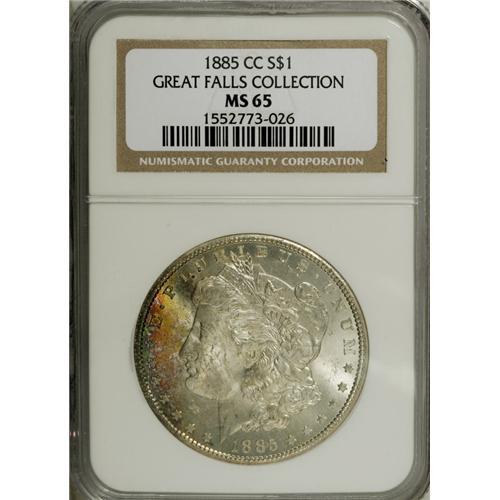 <B>1885-CC S$1 MS65 NGC.</B></I> A crescent of gold, crimson, and green iridescence rests near the left obverse border. This Gem is well struck and lustrous, with faint roller marks (as struck) across Liberty's ear and light toning streaks across her cheek. A scrape beneath Liberty's chin limits the grade. The reverse is bright, frosty, brilliant, and nearly mark-free.<BR><I>From The Great Falls Collection.</B></I><BR><BR><b>Shipping:</b> Coins & Currency (<a target="_blank" href="http://www.heritageauctions.com/common/shipping.php">view shipping information</a>)