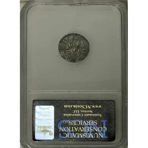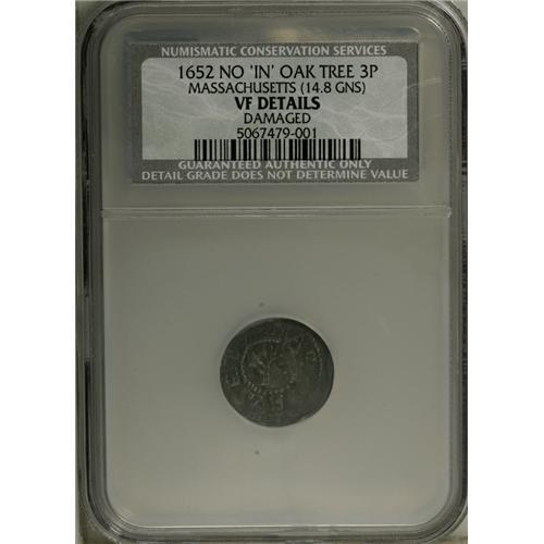 <B>1652 3PENCE Oak Tree Threepence--Damaged--NCS. VF Details.</B></I> Crosby 3-A2, Noe-25, R.6. 14.8 grains. Most of the tree and the majority of the legend letters are bold on this rare Noe variety. The blended jade-green and brown toning is attractive. Bent at one time vertically on each side of the tree, since straightened. A straight mint clip at 11 o'clock affects portions of a few letters. Moderately off center toward 9 o'clock, as made.<BR><I>From The Jones Beach Collection.</B></I><BR><BR><b>Shipping:</b> Coin/Currency (<a target="_blank" href="http://www.heritageauctions.com/common/shipping.php">view shipping information</a>)