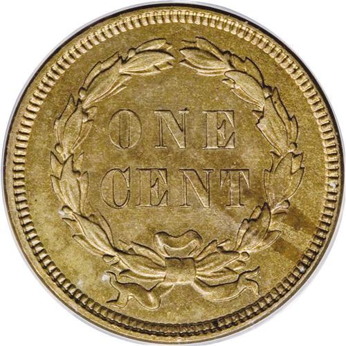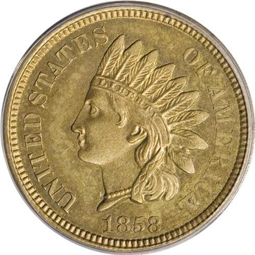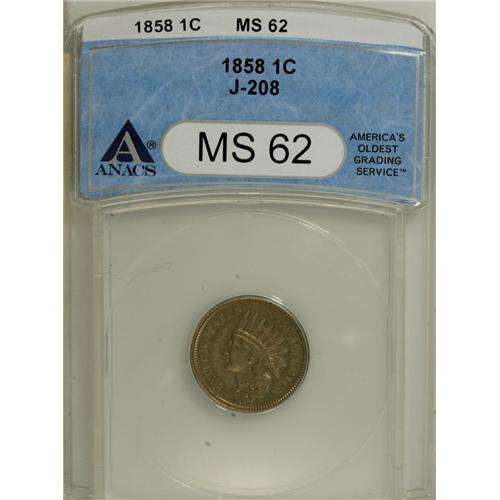<B>1858 P1C Indian Cent, Judd-208, Pollock-259, R.1, MS62 ANACS.</B></I> The obverse has the date centered rather than low with the rounded bust of 1860 and later issues. The reverse has a laurel wreath with five-leaf clusters. Struck in copper-nickel with a plain edge. A common pattern that is popular as a transitional issue. The surfaces are light tan-gray with lilac accents on each side. A shallow lint mark is located in the left obverse field in front of the Indian's chin.<BR><I>From The Lanterman's Mill Collection, Part Two.</B></I><BR><BR><b>Shipping:</b> Coins & Currency (<a target="_blank" href="http://www.heritageauctions.com/common/shipping.php">view shipping information</a>)