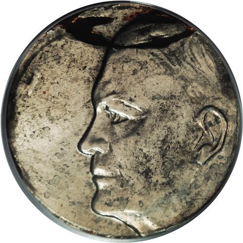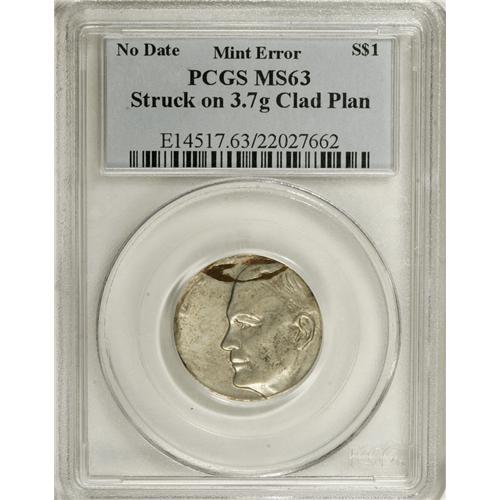 <B>Undated $1 Eisenhower Dollar--Struck on a 3.7 gram Clad Planchet--MS63 PCGS.</B></I> First reverse type, which suggests the piece was minted in 1971 or 1972. The 3.7 gram planchet is heavier than a dime, and lighter than a quarter, and perhaps was intended for a foreign coin struck by the U.S. Mint. Eisenhower's profile is complete, and most of the planet Earth and much of the eagle is on the flan. All legends are absent aside from part of the L in LIBERTY. Portions of the copper core are exposed near the borders.<BR><I>From The Pacific Coast Mint Error Collection.</B></I><BR><BR><b>Shipping:</b> Coins & Currency (<a target="_blank" href="http://www.heritageauctions.com/common/shipping.php">view shipping information</a>)