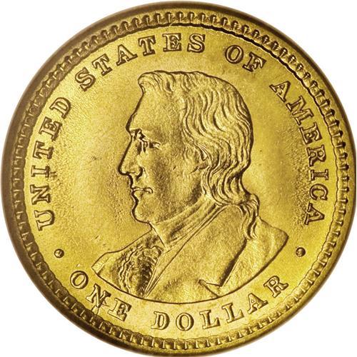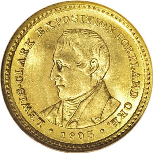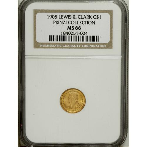 <B>1905 G$1 Lewis and Clark MS66 NGC.</B></I> Our offerings of Premium Gem '05 Lewis and Clark gold dollars have been few and far between. After all, NGC reports just 37 examples of this key date at the MS66 level, with a mere two MS67 representatives finer (12/06). Radiant with a dazzling, satiny finish, this beautiful piece displays deep red-gold color that yields to lime-green near the centers. There is not a single distracting abrasion to report, and the strike is sharp for the type. A coin that represents an important bidding opportunity for the Commemorative gold specialist who will accept nothing but the finest quality.<BR><I>From The Prinzi Trust Collection.</B></I><BR><BR><b>Shipping:</b> Coin/Currency (<a target="_blank" href="http://www.heritageauctions.com/common/shipping.php">view shipping information</a>)