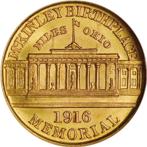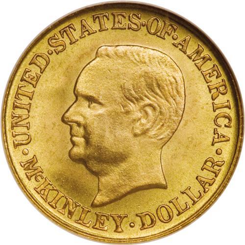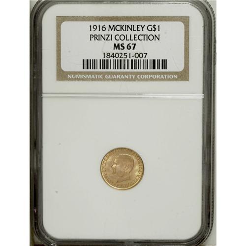<B>1916 G$1 McKinley MS67 PCGS.</B></I> Satiny and well frosted with a few delicate speckles of coppery patina on the obverse. Faint olive highlights are also noted about the peripheral lettering and borders. The shimmering fields are almost totally undisturbed and only the most insignificant evidence of contact can be detected on the portrait of the slain president. Two well-known engravers by the names of Barber and Morgan are responsible for this two-year commemorative gold design. Census: 49 in 67, 0 finer (12/06).<BR><I>From The Prinzi Trust Collection.</B></I><BR><BR><b>Shipping:</b> Coin/Currency (<a target="_blank" href="http://www.heritageauctions.com/common/shipping.php">view shipping information</a>)