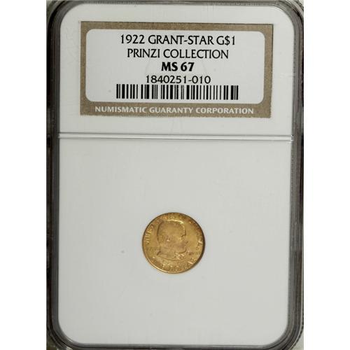<B>1922 G$1 Grant with Star MS67 NGC.</B></I> Struck with pinpoint sharpness and displaying a touch of reddish patina over impeccable satiny surfaces. From both a technical and aesthetic perspective, nearly unsurpassable quality. Unlike their half dollar counterparts, an almost equal number of Star and No Star gold dollars were produced, this variety being just 5,016 pieces. The reason for the inclusion of the star appears to be unknown, but some have conjectured that it's emblematic of Ulysses Grant's status as a general during the Civil War.<BR><I>From The Prinzi Trust Collection.</B></I><BR><BR><b>Shipping:</b> Coin/Currency (<a target="_blank" href="http://www.heritageauctions.com/common/shipping.php">view shipping information</a>)