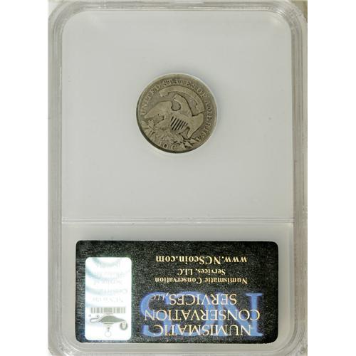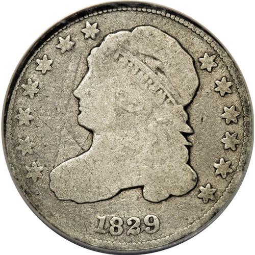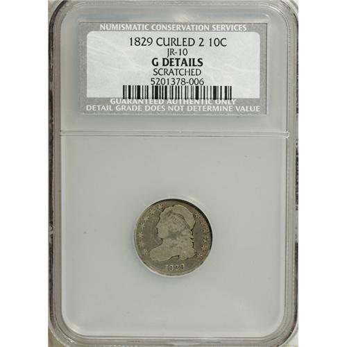 <B>1829 10C Curl Base 2--Scratched--NCS. Good Details.</B></I> JR-10, R.6. John Reich Collectors Society authors (1984) call this "An extremely rare variety that is one of the rarest in the capped bust series. Finest seen is F-15." A curl base 2 and a small 10C attribute the variety. Light to medium gray fields highlight lighter gray motifs on this specimen. The design elements are well worn, but completely raised from the fields. LIBERTY shows, as does UNUM, albeit weakly. Two or three shallow scratches are visible in the left obverse field, and a couple of short ones are seen to the right of the eagle's neck. No other significant marks are apparent. The light scratches are well toned over, and should not dissuade prospective bidders from giving serious consideration to this elusive variety.<BR><I>From The Southland Collection.</B></I><BR><BR><b>Shipping:</b> Coins & Currency (<a target="_blank" href="http://www.heritageauctions.com/common/shipping.php">view shipping information</a>) <BR><BR><B>Important notice:</