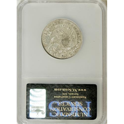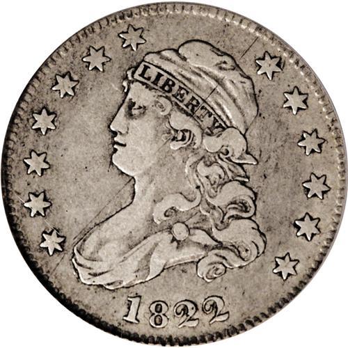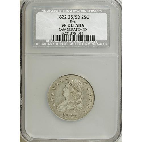 <B>1822 25C 25/50C--Obverse Scratched--NCS. VF Details.</B></I> B-2, R.5. This is the famous Blundered reverse created by the engraver when he placed the wrong denomination in the die, then had to go back and make the correction. The surfaces are light silver-gray with a faint bisecting obverse die crack from 1 o'clock to 7:30.<BR><I>From The Southland Collection.</B></I><BR><BR><b>Shipping:</b> Coins & Currency (<a target="_blank" href="http://www.heritageauctions.com/common/shipping.php">view shipping information</a>) <BR><BR><B>Important notice:</