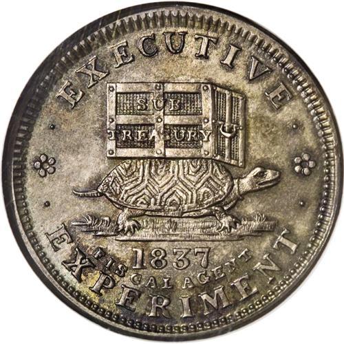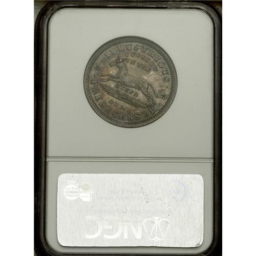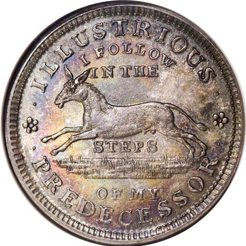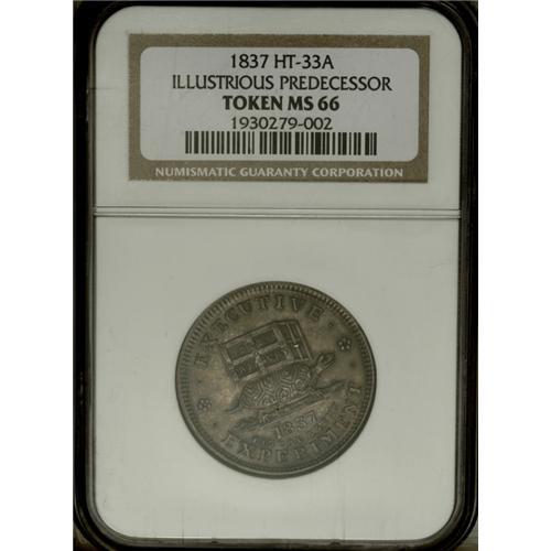 <B>1837 Illustrious Predecessor, Low-19A, HT-33A, MS66 NGC.</B></I> Silver. High R.7. Golden-brown toning drapes the obverse, while the reverse displays more diverse rose, gold, cobalt-blue, and walnut-brown shades. The Low-19 dies are common in copper, but silver examples are extremely rare. The Stack's catalog (lot 67) noted that only four pieces are known, two of which (including the present token) were owned by Ford. The strike is penetrating, and the lack of any detectable marks confirms the extraordinary quality. This piece must have been well cared for since its day of production. For pedigree purposes, this example can be identified by a brief lintmark beneath the center of the lower left donkey leg. Only two Hard Times tokens are met with in silver, Low 19 and Low 62 with the 19 type being much rarer. The reason for the issuance of these tokens in silver has not been explained. They are probably not Bushnell productions.<BR><I>Ex: John J. Ford, Jr. Collection, Part IV (Stack's, 6/04), lot 68, which realized $12,650.Only two Hard Times tokens are met with in silver, Low 19 and Low 62 with the 19 type being much rarer. The reason for the issuance of these tokens in silver has not been explained. They are probably not Bushnell productions.</B></I><BR><I>From The Troy Wiseman Collection, Part Two.</B></I><BR><BR><b>Shipping:</b> Coin/Currency (<a target="_blank" href="http://www.heritageauctions.com/common/shipping.php">view shipping information</a>)