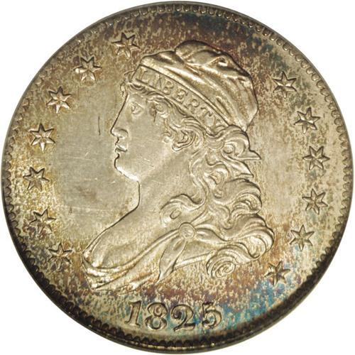 <B>1825/3 25C --Improperly Cleaned--NCS. Unc. Details.</B></I> B-2, R.2. Lovely electric-blue and golden-brown borders cede to light cream-gray centers. Luster dominates the borders and devices, and a few wispy hairlines have little effect on the undeniable eye appeal. <BR><I>From The Lanterman's Mill Collection.</B></I><BR><BR><b>Shipping:</b> Coin/Currency (<a target="_blank" href="http://www.heritageauctions.com/common/shipping.php">view shipping information</a>)
