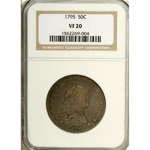<B>1795 50C 2 Leaves VF20 NGC.</B></I> O-119, R.4. The elongated die lump above star 15 aids identification. Star 1 pierces the lowest curl, which is tattered at the end. On the reverse a leaf point touches the left base of I in UNITED. This attractive piece shows moderate wear, as expected, but is a classic, problem-free example for the grade, well centered, with steel-gray surfaces and no singular abrasions.<BR><I>From The Lanterman's Mill Collection.</B></I><BR><BR><b>Shipping:</b> Coin/Currency (<a target="_blank" href="http://www.heritageauctions.com/common/shipping.php">view shipping information</a>)