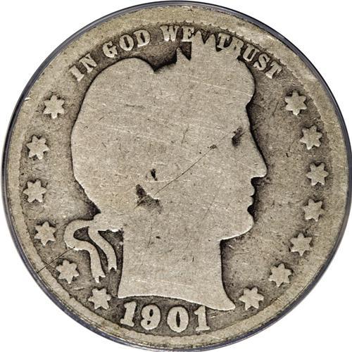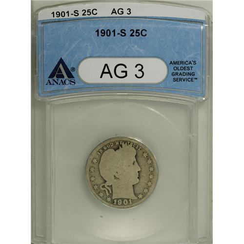 <B>1901-S 25C AG3 ANACS.</B></I> The 1901-S quarter is always a popular issue, regardless of grade. And the vast majority of known examples are in the AG-VG grade range. Such pieces are always eagerly bought by collectors, even when a higher grade coin might be preferred since VF-XF coins are virtually non-existent and significantly higher in price. This piece is well worn into the rims and light overall with darker patina surrounding the devices. A problem-free coin for the grade.<BR><I>From The Twin Hollows Collection, Part Two.</B></I><BR><BR><b>Shipping:</b> Coins & Currency (<a target="_blank" href="http://www.heritageauctions.com/common/shipping.php">view shipping information</a>)