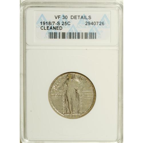 <B>1918/7-S 25C --Cleaned--ANACS. VF30 Details.</B></I> Faint hairlines show up under magnification on this key-date representative. A splash of relatively deep lemon color gravitates to Liberty's head and shield, and occasional whispers of lower intensity shades of the same color are seen under magnification. The surfaces on both sides are devoid of mentionable abrasions.<BR><I>From The Twin Hollows Collection, Part Two.</B></I><BR><BR><b>Shipping:</b> Coins & Currency (<a target="_blank" href="http://www.heritageauctions.com/common/shipping.php">view shipping information</a>)
