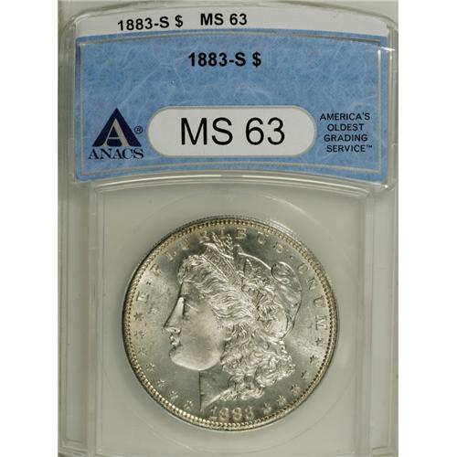 <B>1883-S S$1 MS63 ANACS.</B></I> Lustrous surfaces display well defined devices, save for minor softness in the hair over Liberty's ear. A few minute marks on each side define the grade.<BR><I>From The Twin Hollows Collection, Part Two.</B></I><BR><BR><b>Shipping:</b> Coins & Currency (<a target="_blank" href="http://www.heritageauctions.com/common/shipping.php">view shipping information</a>)
