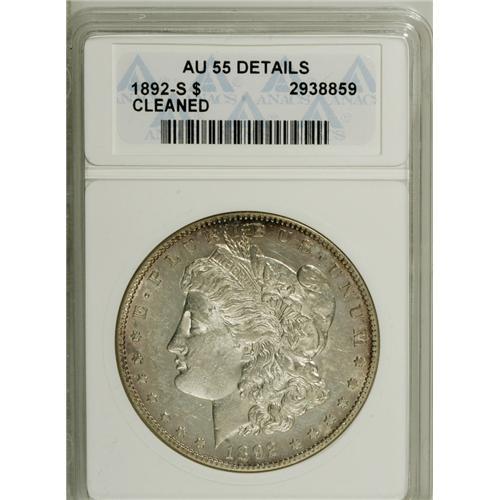 <B>1892-S S$1 --Cleaned--ANACS. AU55 Details.</B></I> This key-date Morgan retains a fair amount of luster. Lightly cleaned surfaces display wisps of light reddish color around the peripheries, along with nicely defined design features. A few minute marks are noted on the obverse, but the prospective bidder should not be turned off by these less-than-significant impairments.<BR><I>From The Twin Hollows Collection, Part Two.</B></I><BR><BR><b>Shipping:</b> Coins & Currency (<a target="_blank" href="http://www.heritageauctions.com/common/shipping.php">view shipping information</a>)