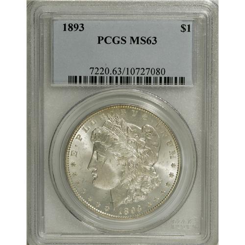<B>1893 S$1 MS63 PCGS.</B></I> Pleasing luster enlivens silver-gray surfaces that are lightly toned around the peripheries. Adequately struck throughout. The reverse reveals impeccably preserved surfaces, while the obverse has a few grade-defining marks.<BR><I>From The Twin Hollows Collection, Part Two.</B></I><BR><BR><b>Shipping:</b> Coins & Currency (<a target="_blank" href="http://www.heritageauctions.com/common/shipping.php">view shipping information</a>)