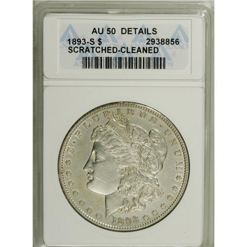 <B>1893-S S$1 --Scratched, Cleaned--ANACS. AU50 Details.</B></I> Cleaning has rendered this coin bright as a headlight, but noticeable traces of mint luster still surround the devices. A Y-shaped scratch in the upper left obverse field accounts for the "Scratched" designation by ANACS. Light wear is seen over the highpoints of the devices.<BR><I>From The Twin Hollows Collection, Part Two.</B></I><BR><BR><b>Shipping:</b> Coins & Currency (<a target="_blank" href="http://www.heritageauctions.com/common/shipping.php">view shipping information</a>)