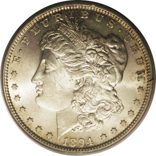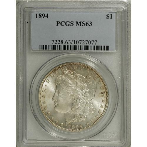 <B>1894 S$1 MS63 PCGS.</B></I> Only 110,000 pieces were struck for circulation of the 1894 dollar. So few high grade Uncirculated pieces are known that the price of proof 1894s has long been elevated above other dates with similar mintages and survival rates. This is a solid Mint State coin that has smooth, satiny mint luster over both sides. Mostly brilliant, there is an accent of soft golden patina around the obverse and reverse rims. Well, but not fully struck, there are minimal abrasions present for a coin of this grade.<BR><I>From The Twin Hollows Collection, Part Two.</B></I><BR><BR><b>Shipping:</b> Coins & Currency (<a target="_blank" href="http://www.heritageauctions.com/common/shipping.php">view shipping information</a>)