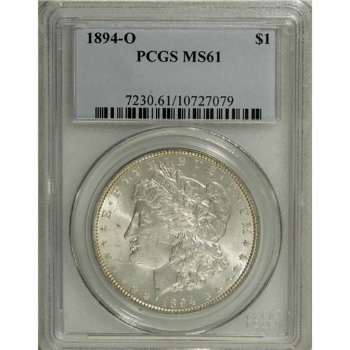 <B>1894-O S$1 MS61 PCGS.</B></I> Lustrous surfaces reveal some light sprinkles of gold color at the margins, and show generally well struck motifs, save for the usual softness in the hair over Liberty's ear. Moderate obverse abrasions limit the grade.<BR><I>From The Twin Hollows Collection, Part Two.</B></I><BR><BR><b>Shipping:</b> Coins & Currency (<a target="_blank" href="http://www.heritageauctions.com/common/shipping.php">view shipping information</a>)