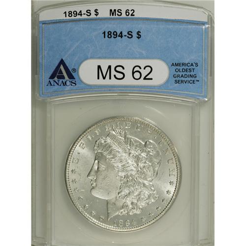 <B>1894-S S$1 MS62 ANACS.</B></I> Bright, untoned surfaces yield exceptionally well struck motifs. A few small marks on Liberty's cheek and neck define the grade.<BR><I>From The Twin Hollows Collection, Part Two.</B></I><BR><BR><b>Shipping:</b> Coins & Currency (<a target="_blank" href="http://www.heritageauctions.com/common/shipping.php">view shipping information</a>)