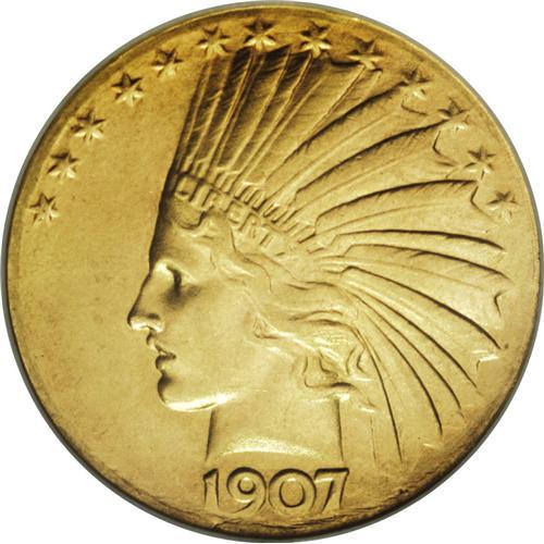 <B>1907 $10 Wire Rim MS62 NGC.</B></I> Light yellow-gold surfaces with faint greenish tendencies. This piece is satiny and fully lustrous with thin wire rims around the entire coin on both sides, much like the wire rim High Relief double eagles. For the specialist in Indian gold coinage, this piece represents the art of Augustus Saint-Gaudens as he intended it to be, before Charles Barber got his hands on the design to make his "improvements." The generally accepted mintage figure is 500 coins, but many were saved and pieces are usually available for a price.<BR><I>From The Twin Hollows Collection.</B></I><BR><BR><b>Shipping:</b> Coin/Currency (<a target="_blank" href="http://www.heritageauctions.com/common/shipping.php">view shipping information</a>)