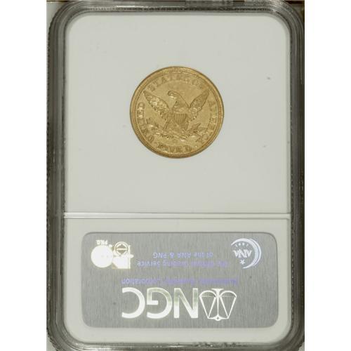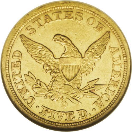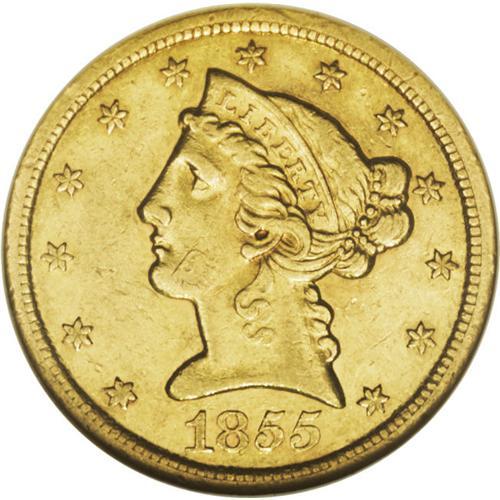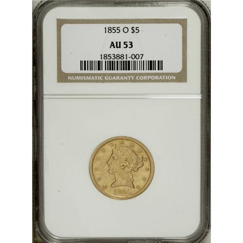 <B>1855-O $5 AU53 NGC.</B></I> Rare in any grade, the 1855-O was only coined to the extent of 11,100 pieces in pre-Civil War New Orleans. Light field abrasions and chatter on each side are consistent with the grade, and both sides are somewhat prooflike underneath, with beautiful antique-gold coloration. Census: 8 in 53, 20 finer (12/06).<BR><I>From The Twin Hollows Collection.</B></I><BR><BR><b>Shipping:</b> Coin/Currency (<a target="_blank" href="http://www.heritageauctions.com/common/shipping.php">view shipping information</a>)