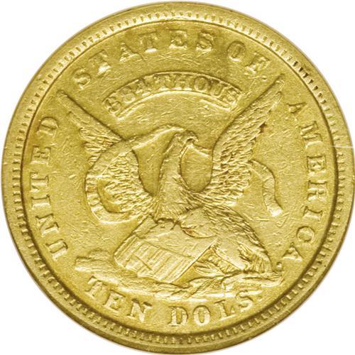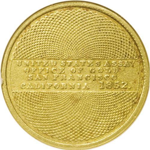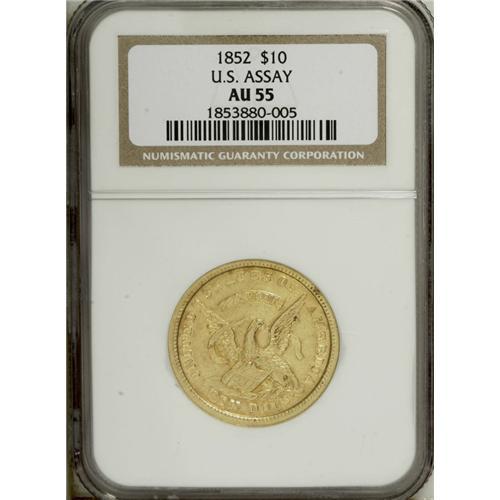 <B>1852 $10 Assay Office Ten Dollar AU55 NGC.</B></I> K-12a, R.5. O in OFFICE is centered under the N in UNITED on this variety. Delectable yellow-gold surfaces show light abrasions consistent with a short stint in the channels of commerce in the rough-and-tumble West of the early days of the California Gold Rush. Considerable luster remains on each side. Listed on page 351 of the 2007 <I>Guide Book.</B></I><BR><I>From The Twin Hollows Collection.</B></I><BR><BR><b>Shipping:</b> Coin/Currency (<a target="_blank" href="http://www.heritageauctions.com/common/shipping.php">view shipping information</a>)