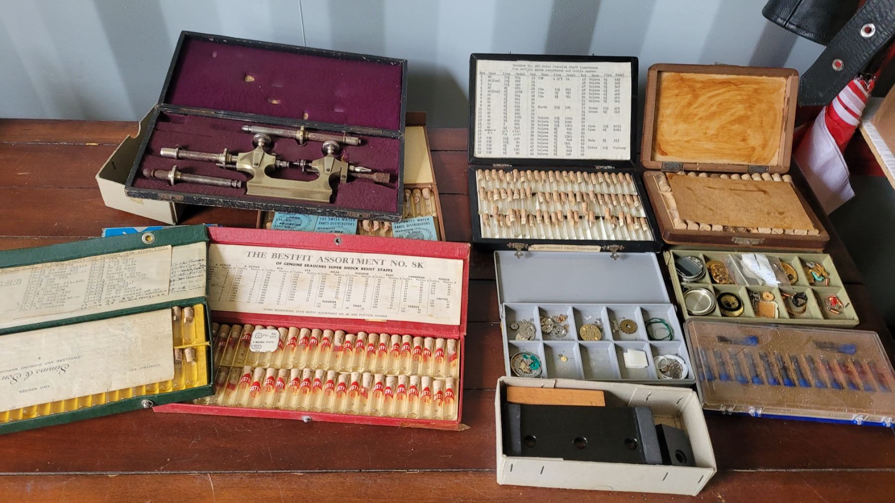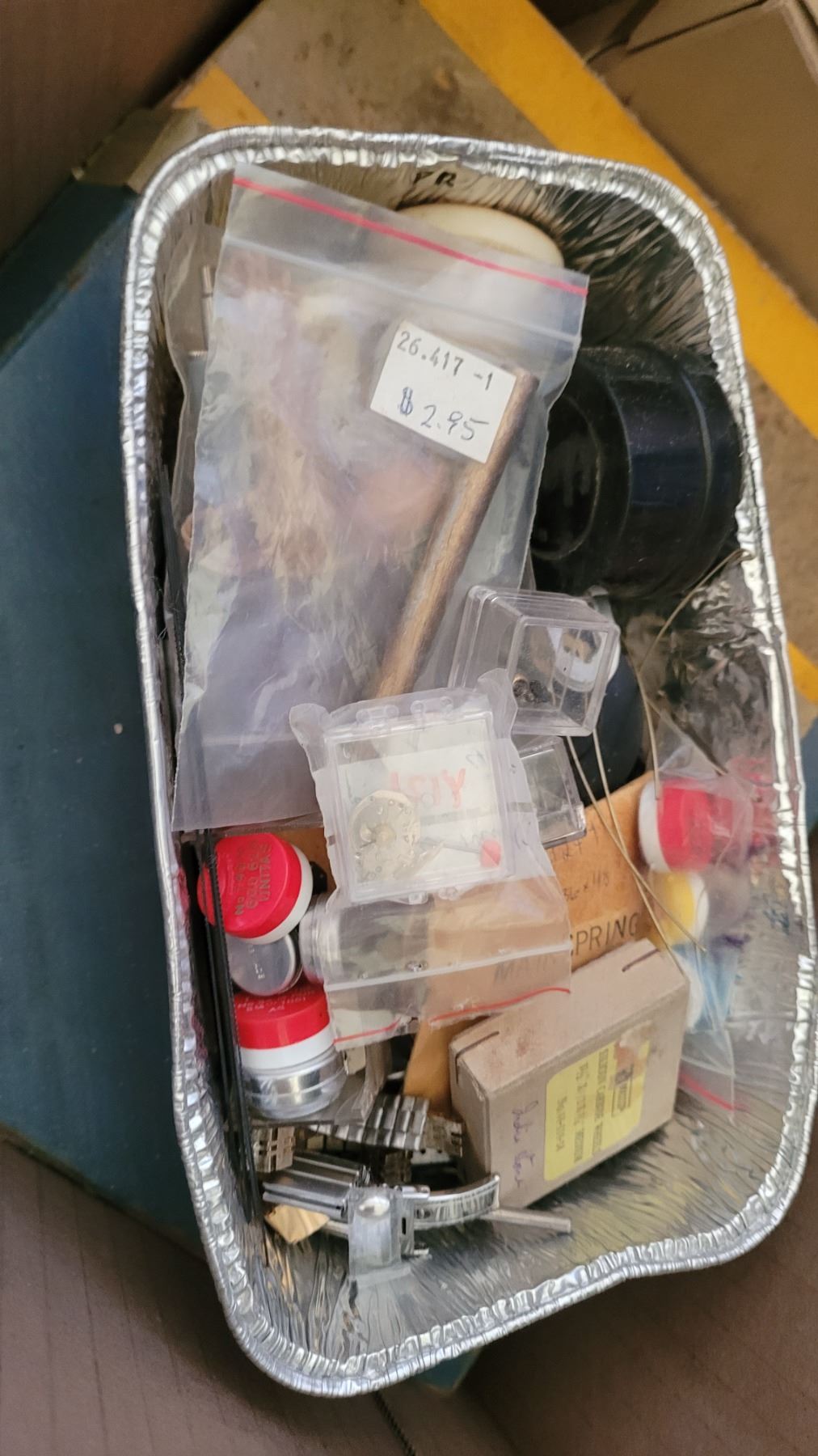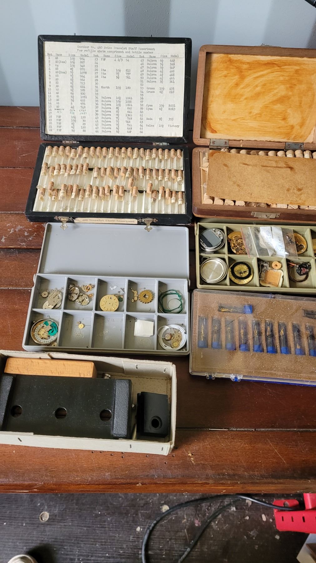 Watch repair instruments and parts. Glass dome clock, untested. Pickup at 10 am