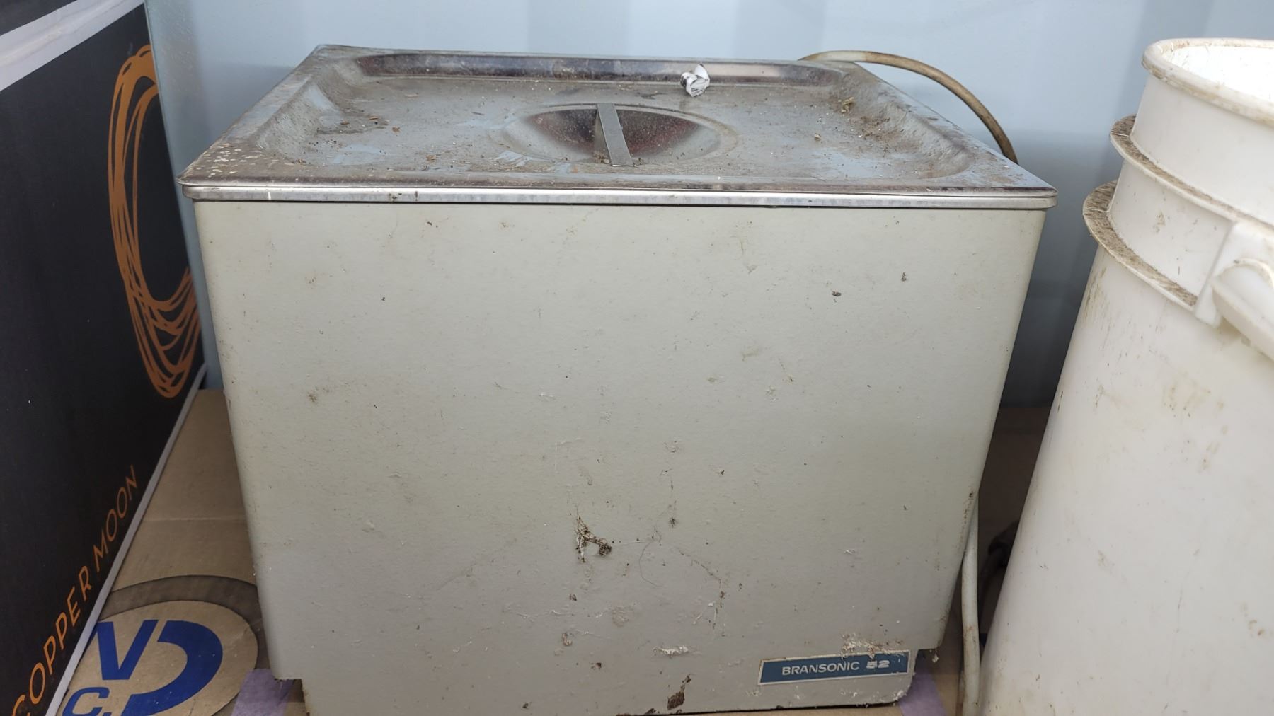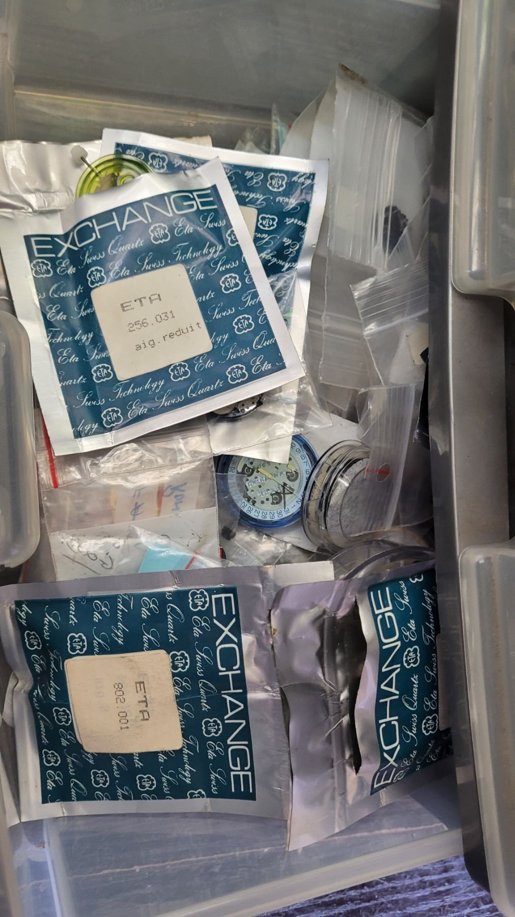 Large assortment of clock and watch repair parts, bucket full of watches for parts, cleaning machine and motors. Pickup at 10 am