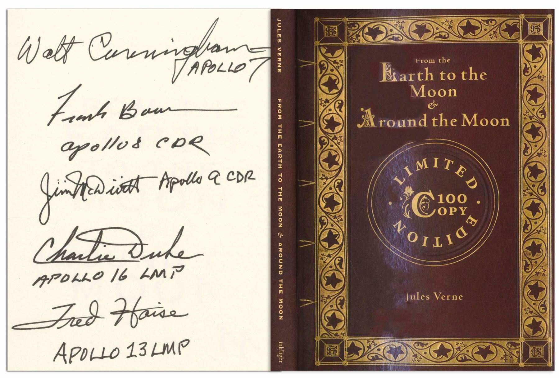 Five Apollo astronauts signed limited edition of Jules Verne's classic novels, ''From the Earth to the Moon & Around the Moon'', a Civil War era imagining of traveling to the moon that wouldn't be accomplished for more than a century later, as evidenced by the five men who sign here: Walt Cunningham of Apollo 7, Frank Borman of Apollo 8, James McDivitt of Apollo 9, Charlie Duke of Apollo 16 and Fred Haise of Apollo 13, who also add their Apollo mission. All men sign in black felt-tip on the front free endpaper. Vancouver, Canada: Inkflight, 2019 in a small limited edition of 100 copies. Book measures 6.375'' x 9.375''. Housed in original dust jacket, in near fine condition.