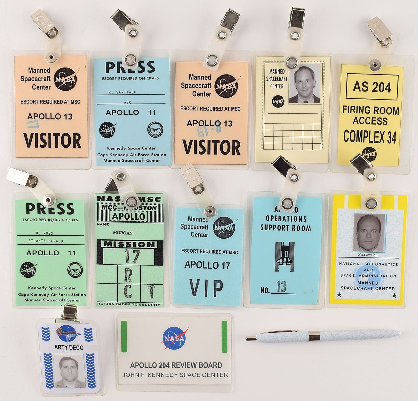 Collection of badges from the 1998 HBO miniseries From the Earth to the Moon, including: three different styles of ID badge, an "AS 204 Firing Room Access" badge, an "Apollo 204 Review Board" badge, two different Apollo 11 press badges, an "Apollo Operations Support Room" badge, two "Apollo 13 Visitor" badges, an "Apollo 17 VIP" badge, and a "NASA-MSC, Mission 17" badge. Also includes a Manned Spacecraft Center prop ballpoint pen. In overall fine condition. Accompanied by a letter of authenticity from a member of the From the Earth to the Moon art department.