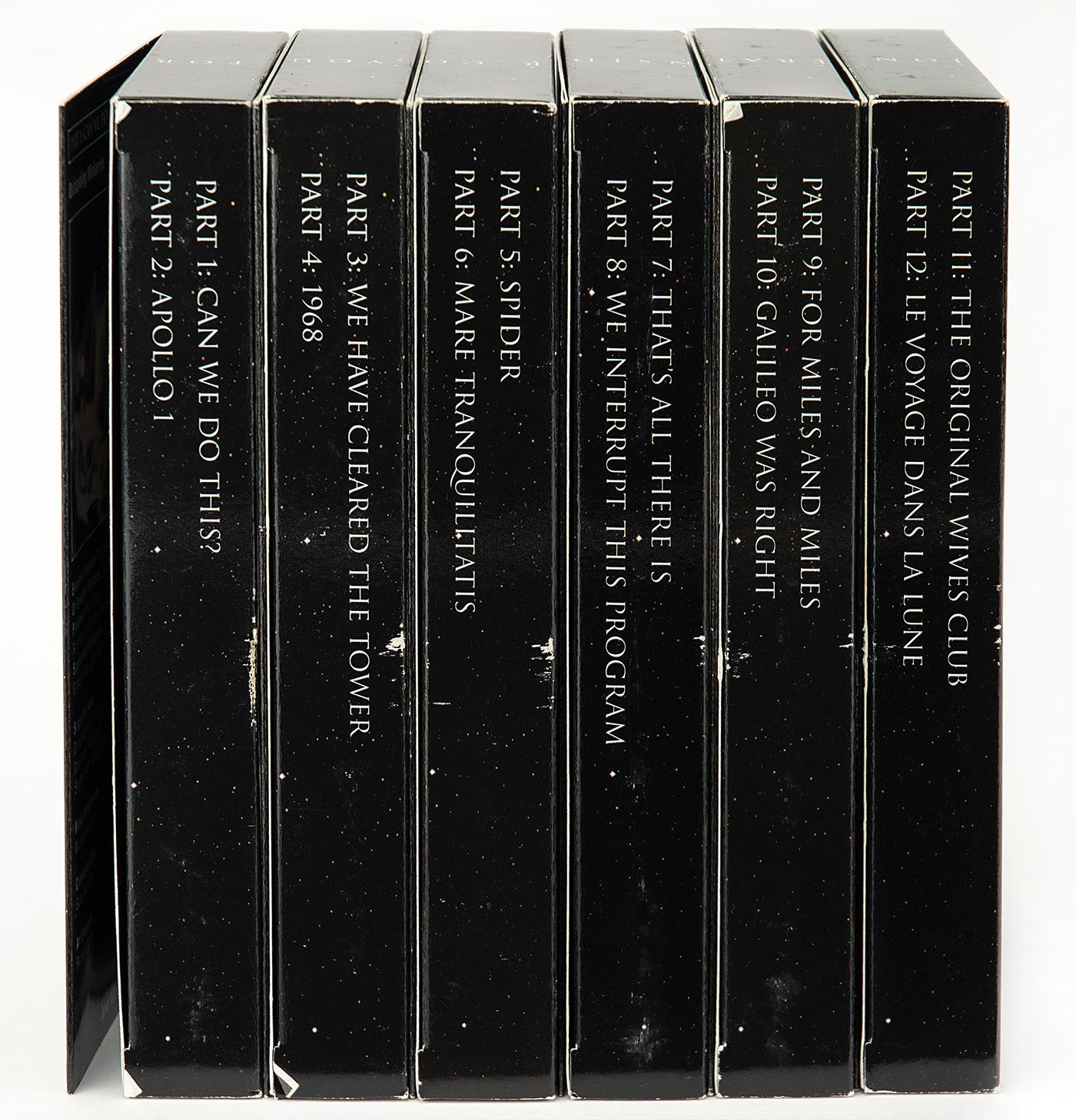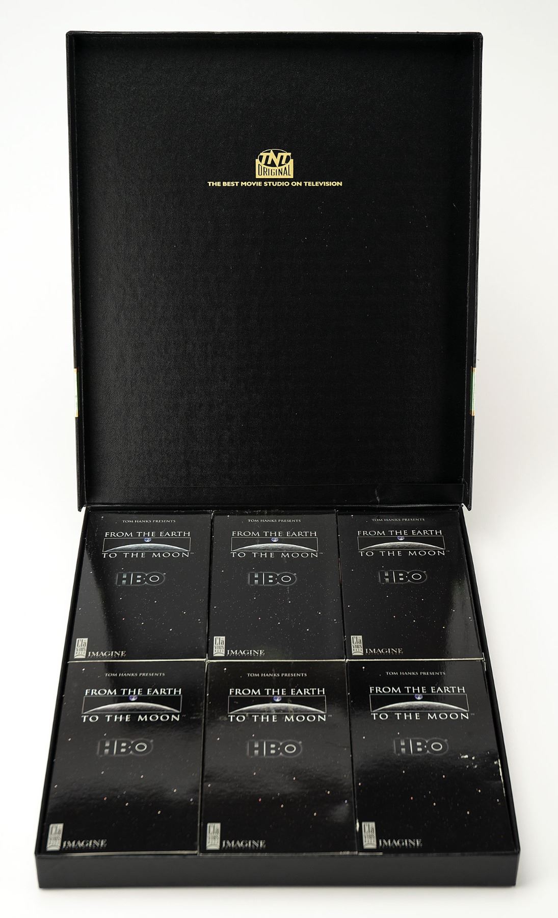 Awards season screener box-set for the 12-part 1998 HBO television miniseries From the Earth to the Moon, containing six video tapes with inside of front covers featuring cast and crew images and award categories. Includes a one-sheet movie poster for Ron Howard's 1995 space docudrama Apollo 13. Housed in an unrelated screener box for a TNT television program. In fine condition, with light creasing to the poster and brochure. Accompanied by a letter of transmittal from the original recipient of the screener set. The tapes are included. From the personal collection of Paul Kruppenbacher, a member of the NASA Houston Landing and Recovery Division who trained Apollo astronauts in water recovery procedures and was deployed on U.S. Navy aircraft carriers for crew and spacecraft recovery operations.