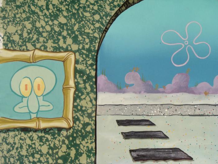 This original hand-painted background and animation cel are from the Nickelodeon TV show SpongeBob Squarepants. The story takes place under the deep blue sea in Bikini Bottom, where SpongeBob resides. SpongeBob, who is a yellow, porous sponge, is your typical happy-go-lucky character, as he is always cheerful and enjoys making people laugh. Patrick Star, SpongeBob's neighbor who is a starfish, is your average children's show idiot, as he boasts knowing nothing and is often getting himself into ridiculous situations. Between the homes of these two lies the home of the miserable Squidward, a squid, who is known for being grouchy and playing tricks on SpongeBob and Patrick. Both SpongeBob and Squidward work at the Krusty Krab, a fast food business run by the greedy money-loving Mr. Krabs, a crab, the arch rival of the evil, possibly misunderstood, Plankton. Another neighbor, Sandy Cheeks, an athletic squirrel who normally wears an astronaut's space suit, was introduced in "Tea at the Treedome." She spends most of her time inventing and experimenting. This is probably what Squidward sees when he opens his front door.Original Production Background and Animated Cel Overall Size of Background: 10 1/4" x 14" Overall Size of the Cel: 10 1/2" x 12 1/2" Very good condition This is an original hand-painted cel set-up used in the production of an episode of "SpongeBob SquarePants." Each one-of-a-kind set-up represents a slight change in position of the characters. When individually photographed and projected in rapid succession, the images appear to move.