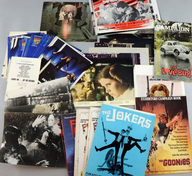 Front of House cards & stills for Star Wars & Devil's Rain along with 55 press book/synopses including James Bond, Back to the Future, Carry on Up The Khyber, Plumbers Mate, some duplicates, (Total 70)