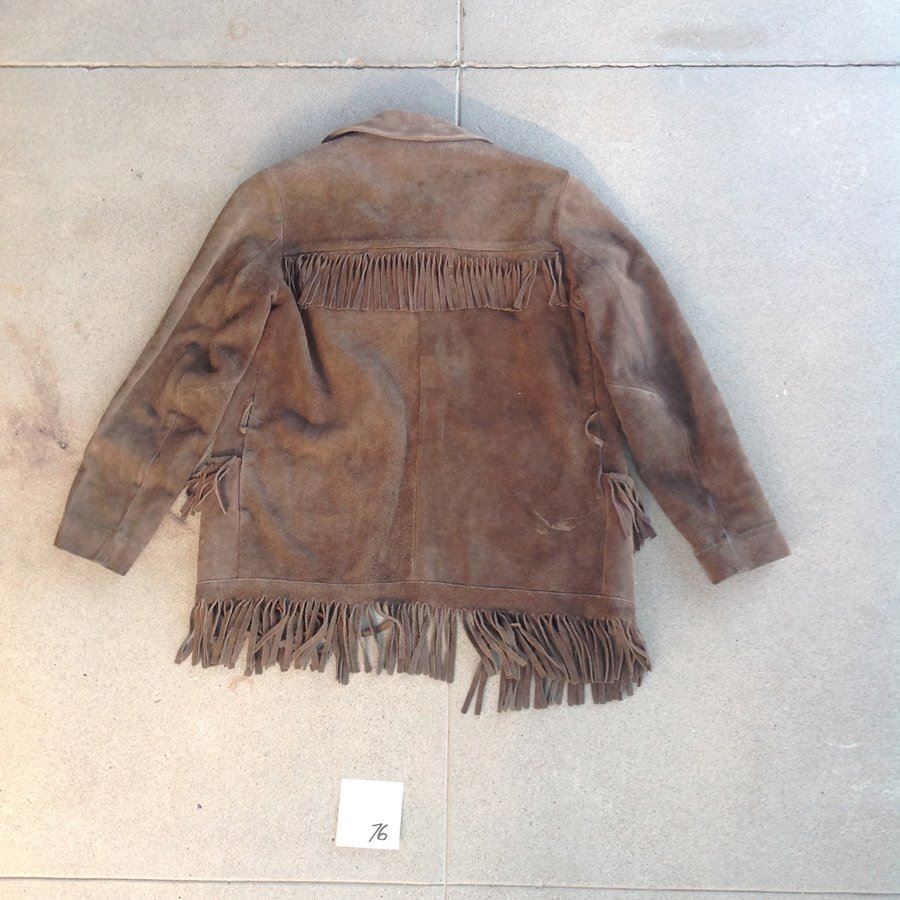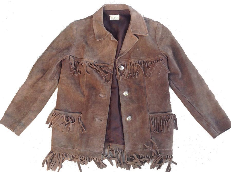 Vintage sueded steer hide coat with fringed accents. Good condition, shows use.,,Adult Med.