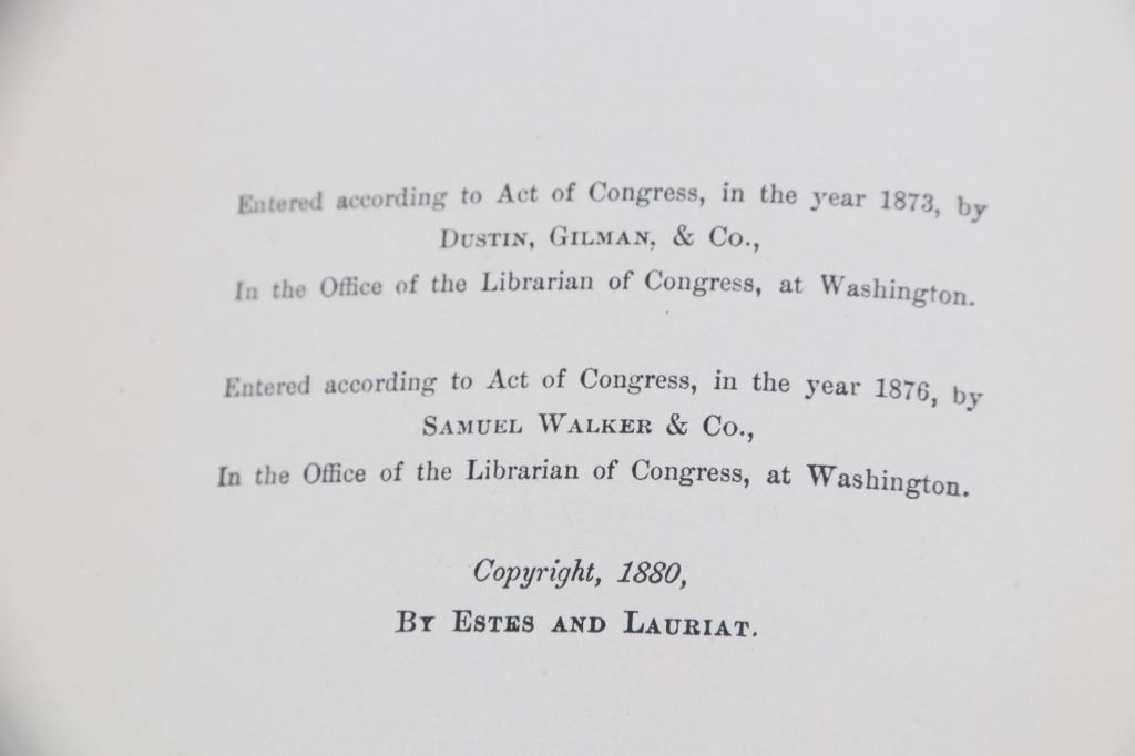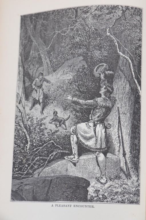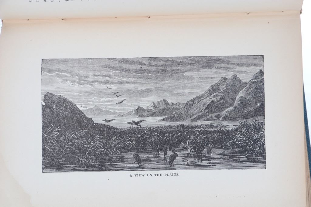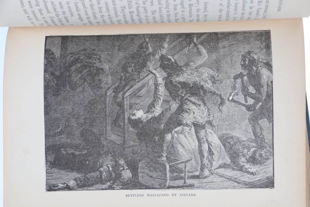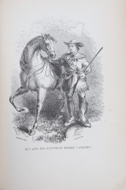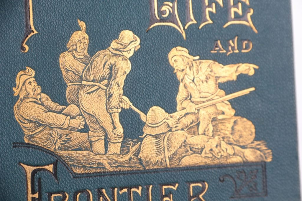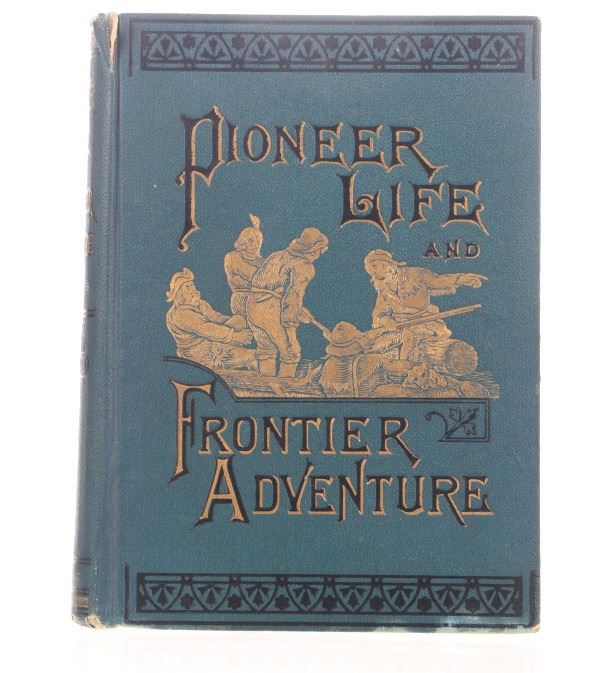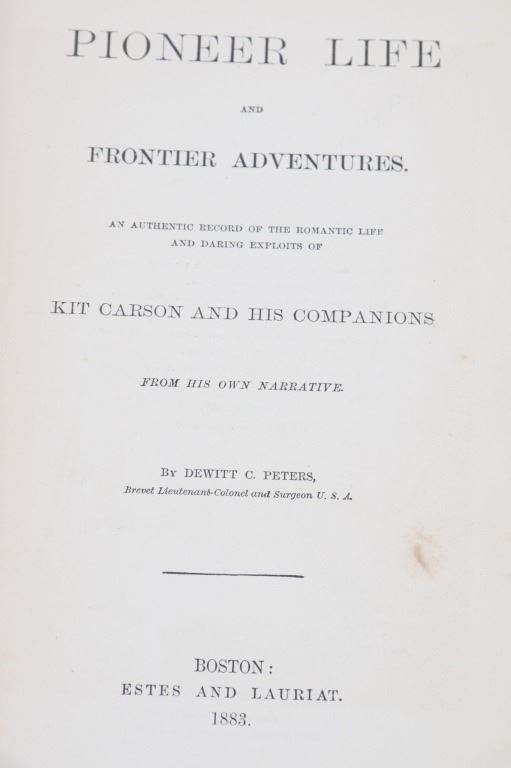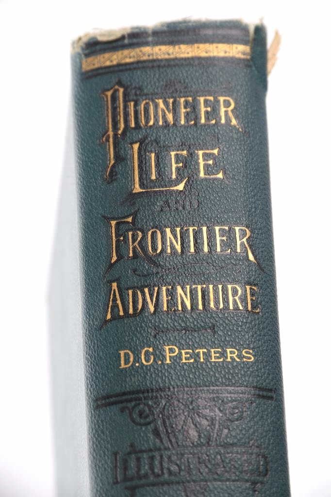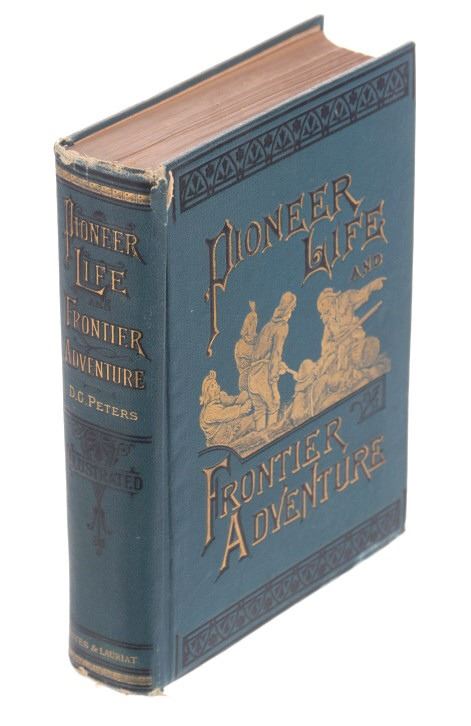 This is an 1883 edition of "Pioneer Life and Frontier Adventure" by Dewitt C. Peters. The book chronicles the life and adventures of Kit Carson and his contemporaries. The book is wonderfully illustrated throughout and features a fantastic black and gold gilt decorated cover and spine. The book is in good condition, with minor damage to the cover and light water damage and foxing to some pages. It measures 6.5" x 8.75".