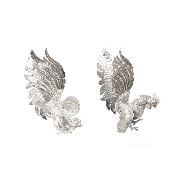 Featured in this lot are two, large silver-plated fighting chickens made in Italy circa 1950-60s. The chickens are in similar positions, low to the gr