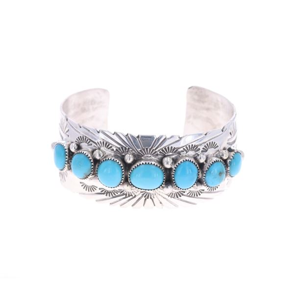 Featured in this lot is a sterling silver turquoise bracelet from Navajo artist, M. Thomas Jr. The bracelet features a wonderfully and professionally
