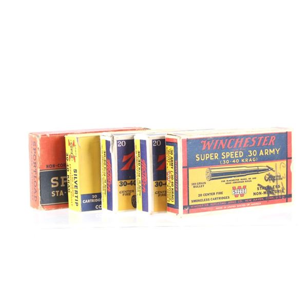 Lot consisting of one full box containing 20 factory Winchester/Western Super X .30-40 Krag cartridges, 180 grain Silvertip, box is excellent; three W