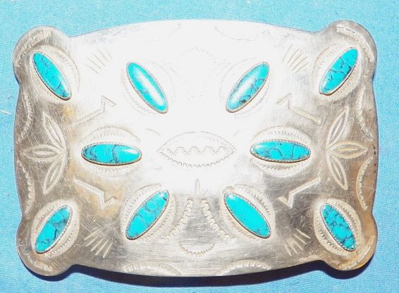 Nickel Silver Frontier Buckle with Turquoise approx size 4 1/2 x 3"