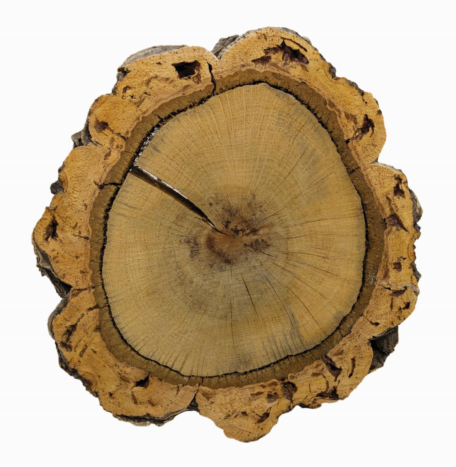 (Disneyland c.2000) An original section taken from a removed cork oak tree in Frontierland. A number of Frontierland trees were removed by the Horticulture Team to maintain Show Quality and to assure the safety of the park's guests. Cross Sections of at least one cork oak tree were gifted to select Park employees at the time of the removal. Measuring 8.5" in diameter and 1.75" thick, the cross section is in good condition, with some natural detachment between the inner bark and cambium, as well as a natural "crack" stretching the radius of one medullary ray.