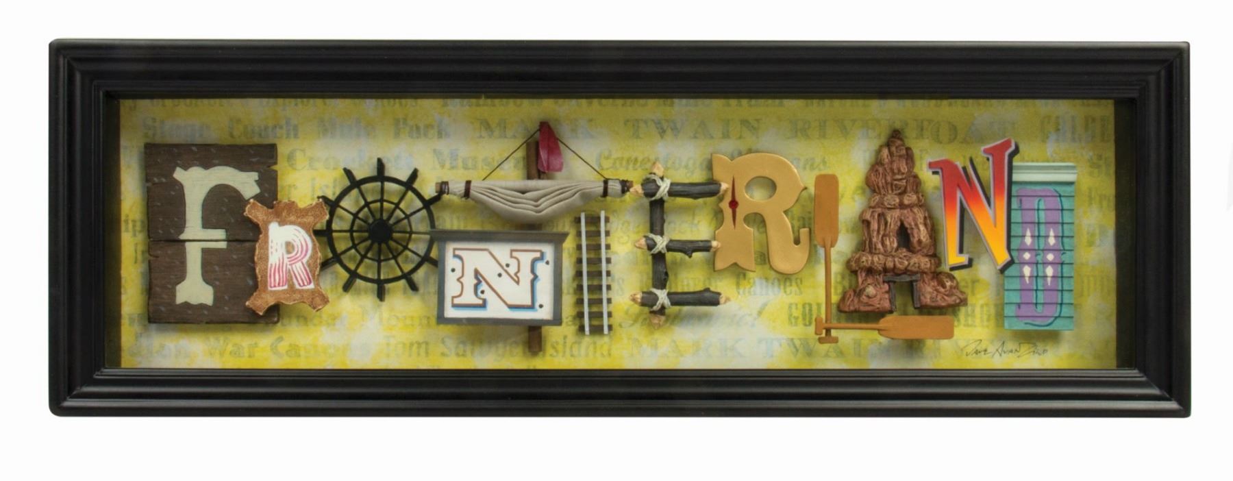 (Disneyland, 2005) A dimensional artwork created by mixed-media artist Dave Avanzino for Disneyland's 50th Anniversary. Avanzino has used many iconic visual elements from Frontierland to spell out the name of the land, such as an animal hide, a "Mark Twain" paddlewheel, "War Canoe" oars, and a spire from "Big Thunder Mountain Railroad", among others. The work comes framed in a sleek black shadowbox, and measures 6.25"x18.75" and 1.75" thick. The condition is very good with minor frame wear.