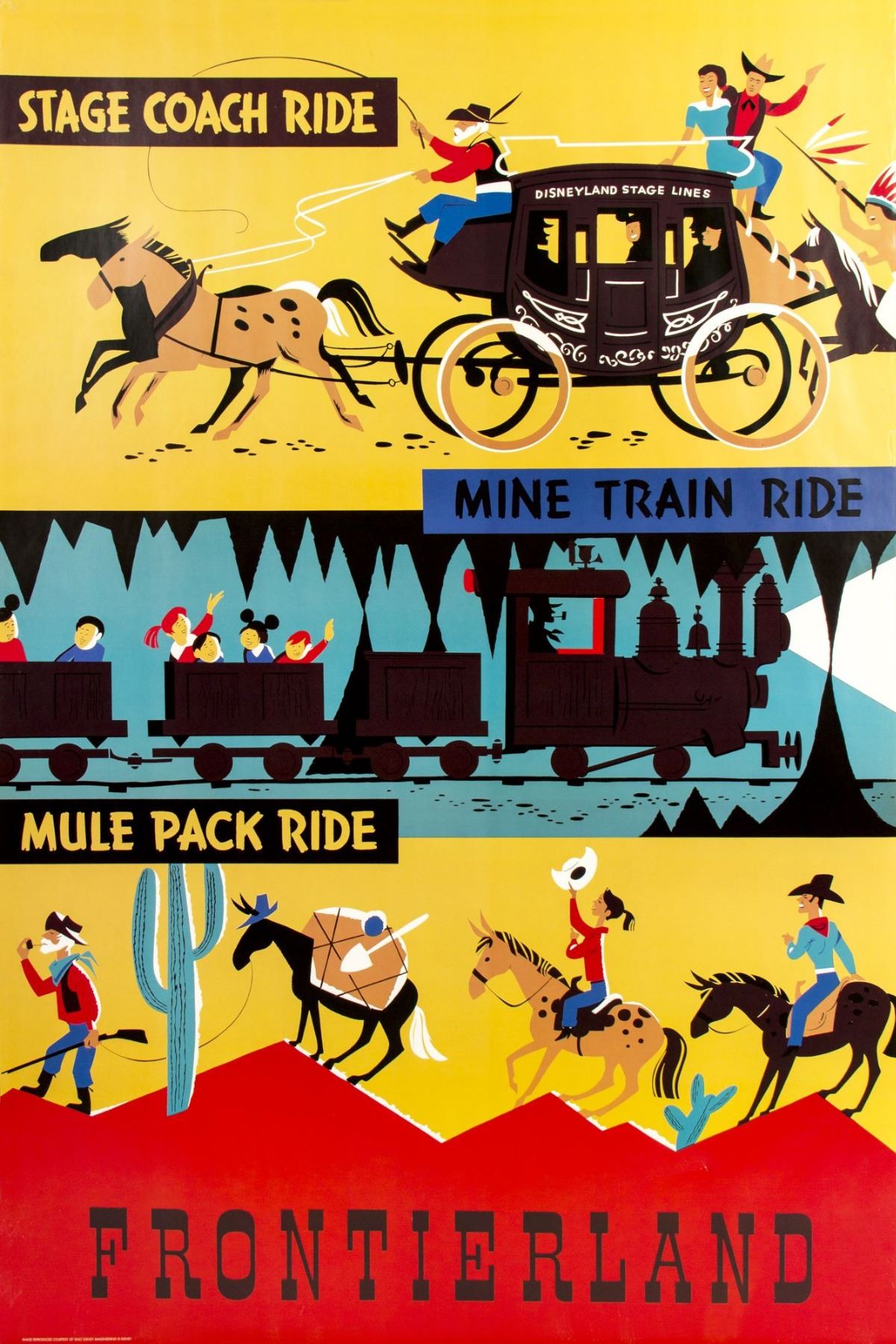 (Disneyland, 1990s) An attraction poster reproduction from the Disney Gallery featuring Frontierland's "Stage Coach Ride", "Mine Train Ride", and "Mule Pack Ride" attractions. For a very short time, the Disney Gallery offered a limited amount of full-size reproduction attraction posters for many of the well-known Disneyland attractions. This faithful replica reads "Image reproduced courtesy of Walt Disney Imagineering" in the lower-left corner. The poster measures 54"x36" and is in very good condition with some edge-wear and some spots of discoloration around the border.