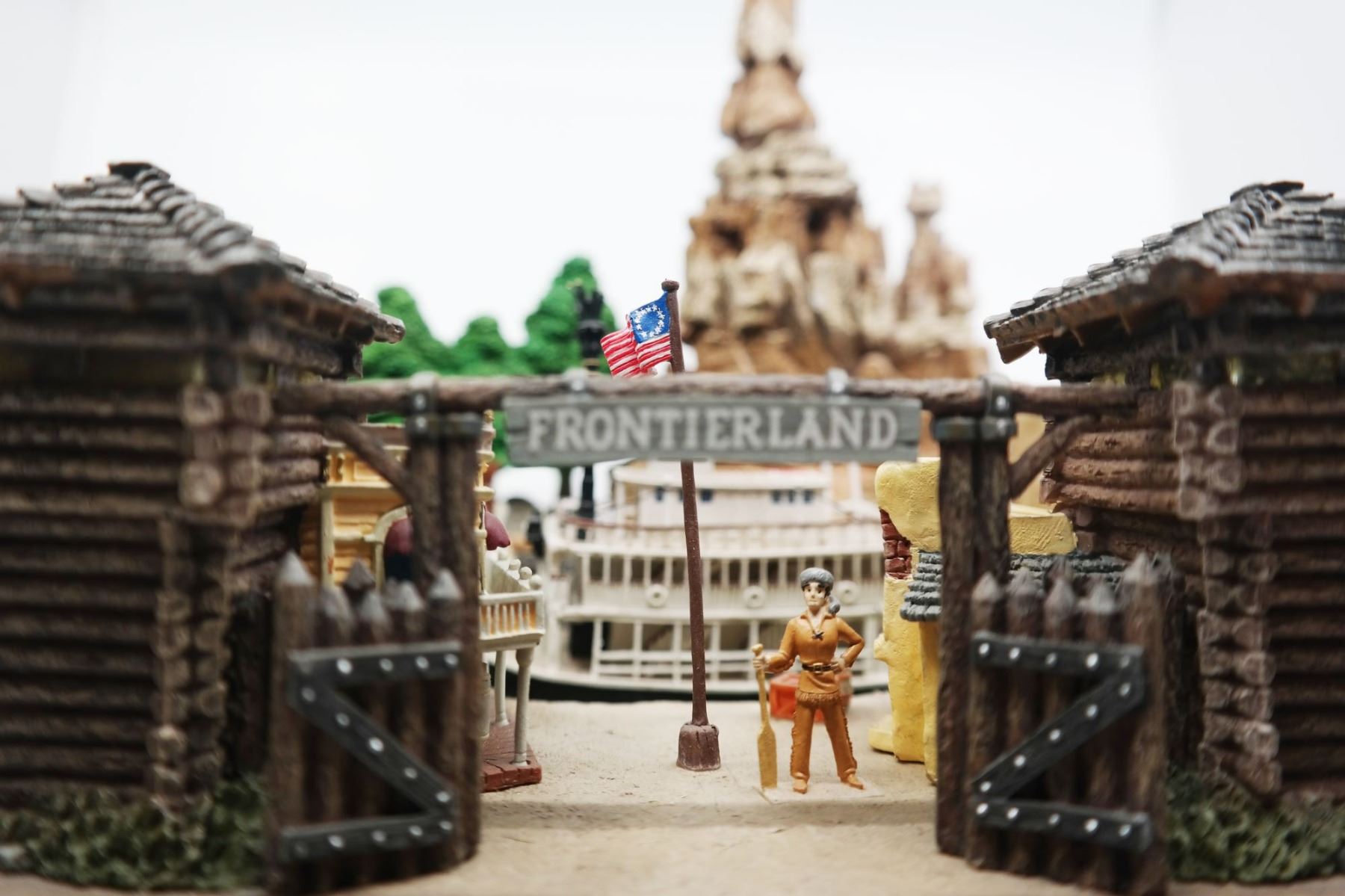 (Disneyland, 2005) A stunning "Magical Big Figurine" created by Larry Nikolai for the 50th anniversary of Disneyland. Depicted are popular attractions such as the "Mark Twain", "The Golden Horseshoe", and "Big Thunder Mountain Railroad". The figure is battery-operated with lights in the Frontierland gate, the top of the "Mark Twain", and the campfire. The figure measures approximately 15" in diameter and 12.5" tall and is in good condition with minor wear throughout.