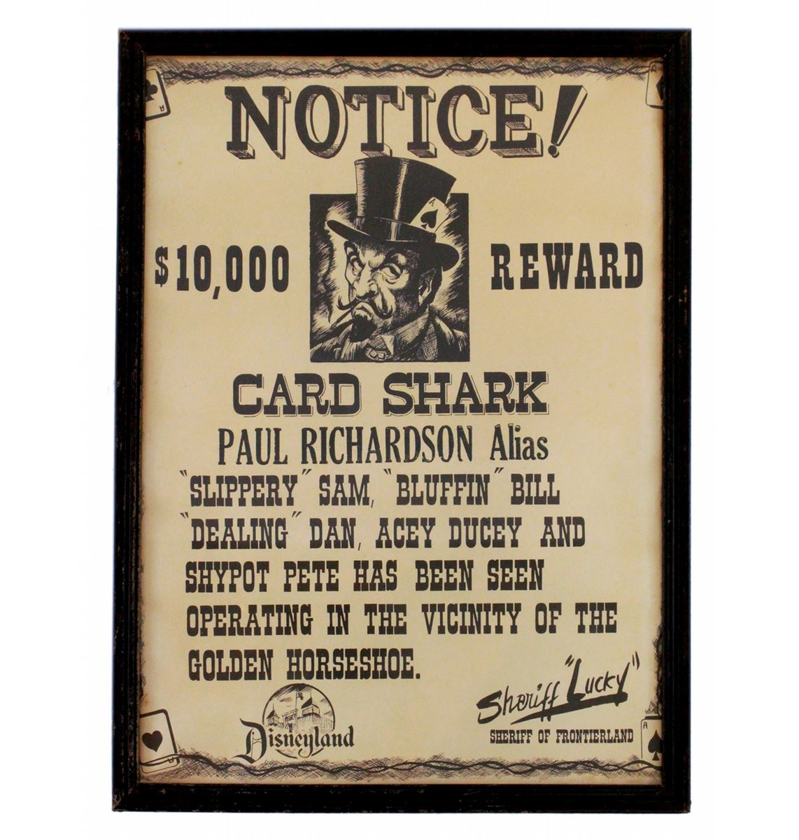 (Disneyland, 1957) Personalized posters and newspapers were available in several locations throughout Disneyland. Having a guest’s name in print was a fairly high-tech novelty in the 1950s and 60s and Disneyland took great advantage of the medium for its themed lands. This “Wanted Poster” uses the image of “Black Bart”, the character who walked the streets of Frontierland in the 1950s. In its’ original wood frame as offered for an extra fee from the print shop. Measuring 16 x 13 in. and in good condition.