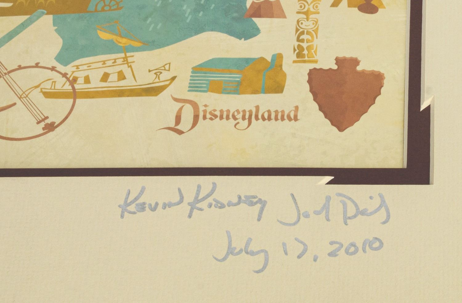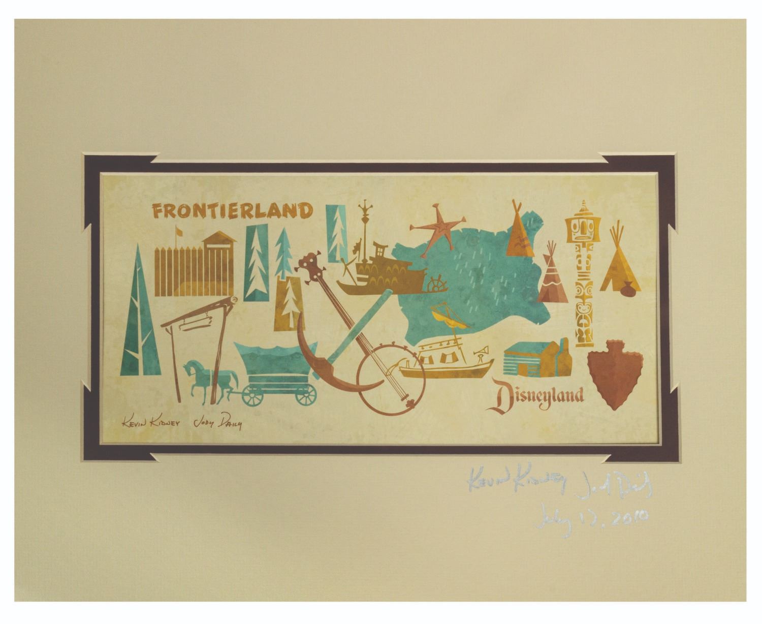 (Disneyland, 2010) An exclusive print featuring early Frontierland icons interpreted into retro designs by Kevin & Jody, in celebration of Disneyland's 55th anniversary. The print is presented in its original double mat, which has been autographed in silver ink by the artists to read : "Kevin Kidney Jody Daily July 17, 2010." Measuring 11"x15.5" with an image size of 6.5"x13.5" within the 14"x18 decorative matting, the piece is in fine condition with only minor edge wear to the mat.