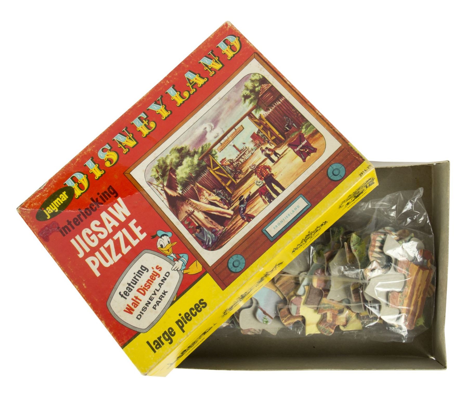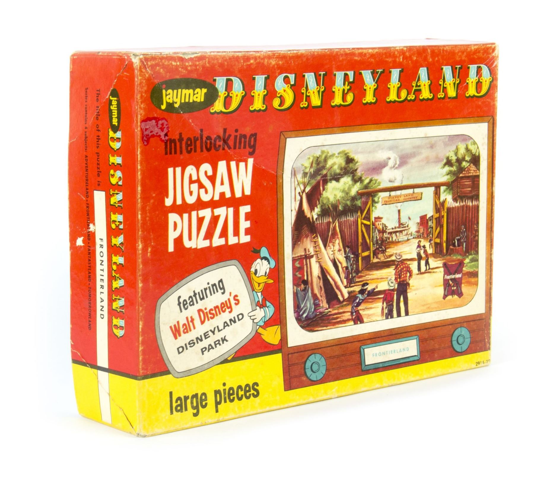 (Disneyland, c.1955) A Frontierland-themed puzzle by Jaymar in its original box. The puzzle is complete and features great imagery of the early Frontierland entrance. The box measures 7.75"x10" and 2.5" thick, and is in good condition with some wear to the box.