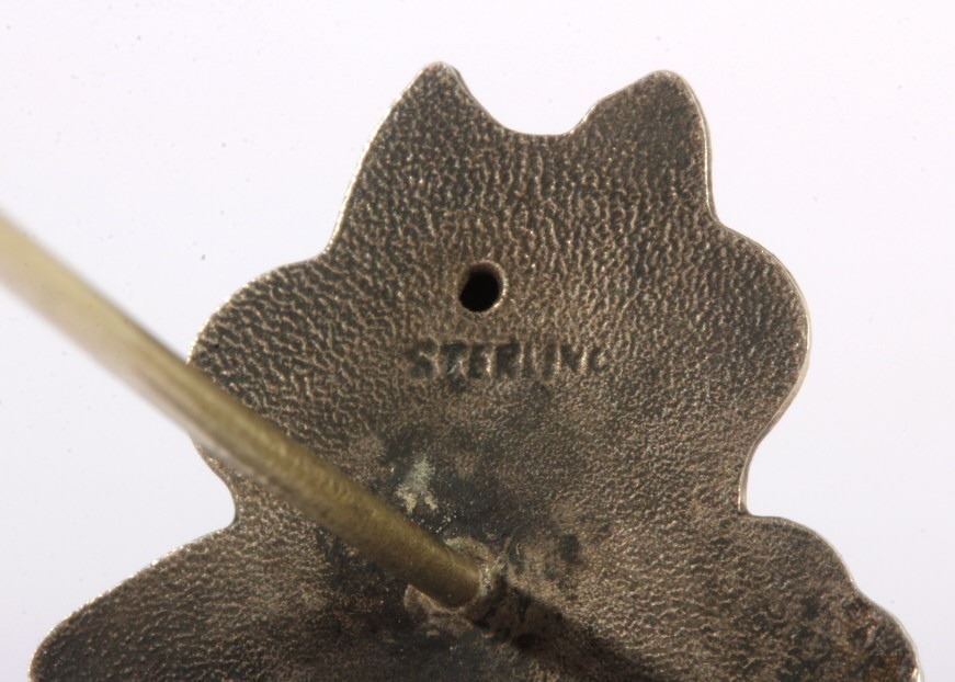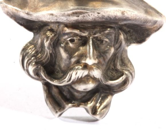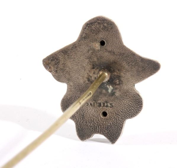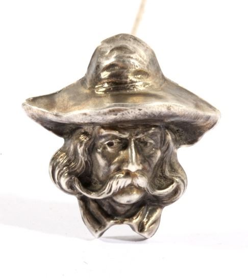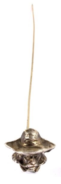 For your bidding pleasure is a frontiersman sterling silver hat pin. This marked sterling piece depicts a traditional frontiersman image. Fine details emphasize his long hair, flowing mustache and prospectors style hat. Pin measures 9.125" long. Image is one inch square.