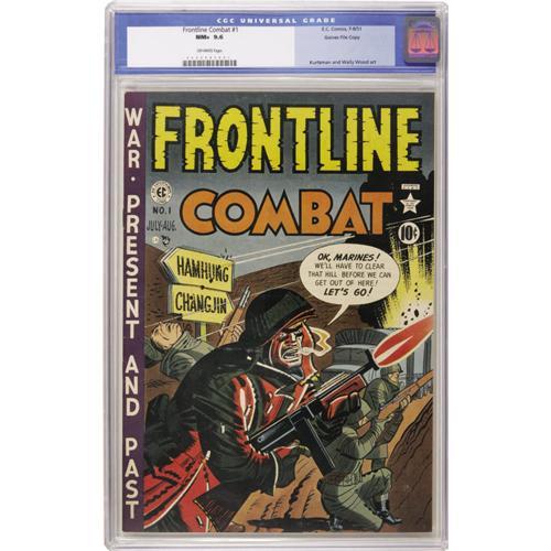 <B>Frontline Combat #1 Gaines File pedigree 3/9 (EC, 1951) CGC NM+ 9.6 Off-white pages.</B></I> Here's a wonderful copy of the premiere issue of the acclaimed Harvey Kurtzman creation. Kurtzman scripted and edited the stories, and contributed interior art. Additional interior art came from Wally Wood, Russ Heath, and Jack Davis. Our offering has earned the highest grade CGC has given to a copy of this issue to date. Overstreet 2006 NM- 9.2 value = $1,025. CGC census 10/06: 3 in 9.6, none higher.<BR><BR><b>Shipping:</b> Slabbed Comic (<a target="_blank" href="http://www.heritageauctions.com/common/shipping.php">view shipping information</a>)
