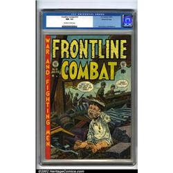 Frontline Combat #10 Gaines File pedigree 6/9 (EC, 1953). One of the many factors that sets EC comics apart from their contemporaries is their willingness to explore and portray the human side of an issue. This John Severin/Will Elder cover shows a war orphan crying amidst the rubble that had once been his home. Ahead of its time, this editorial style wouldn't become en vogue until late in the Vietnam era. Contributing artists in this issue include such EC legends as Jack Davis, George Evans and Wally Wood. There are only nine Gaines File copies of this issue extant. The condition is truly superb. The front cover, spine and corners are flawless, and the back cover has only a very minor ding at the bottom edge. Very conservatively graded, this copy compares very favorably to many of the 9.6s and 9.8s. CGC NM- 9.2 Off-white to white pages. Overstreet 2001 NM 9.4 value = $175. Important notice: We expect to be auctioning lots at the rate of 200-250 per hour. Sometimes eBay Premier live bid software cannot keep up with that pace, so we strongly recommend that you place a realistic proxy bid now as insurance to avoid disappointment. Also please note that all Heritage/CAA lots purchased through eBay Premier carry a 20% Buyer's Premium.