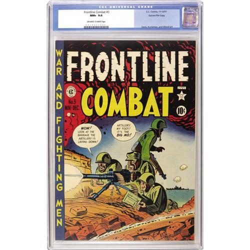 <B>Frontline Combat #3 Gaines File pedigree 3/9 (EC, 1951) CGC NM+ 9.6 Off-white to white pages.</B></I> Editor Harvey Kurtzman does the cover, the interior scripting, and much of the interior art on this title, but allows some expert interior art assistance from the likes of Jack Davis, Wally Wood, and John Severin -- all pretty good reasons for liking this title. Here's another wondrous file copy, and its grade is the highest CGC has awarded to date for the issue. Overstreet 2006 NM- 9.2 value = $435. CGC census 10/06: 2 in 9.6, none higher.<BR><BR><b>Shipping:</b> Slabbed Comic (<a target="_blank" href="http://www.heritageauctions.com/common/shipping.php">view shipping information</a>)